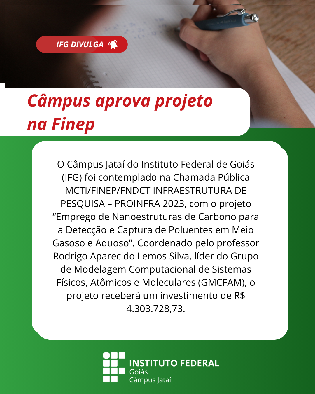 O Câmpus Jataí do Instituto Federal de Goiás (IFG) foi contemplado na Chamada Pública MCTI/FINEP/FNDCT INFRAESTRUTURA DE PESQUISA – PROINFRA 2023, com o projeto “Emprego de...