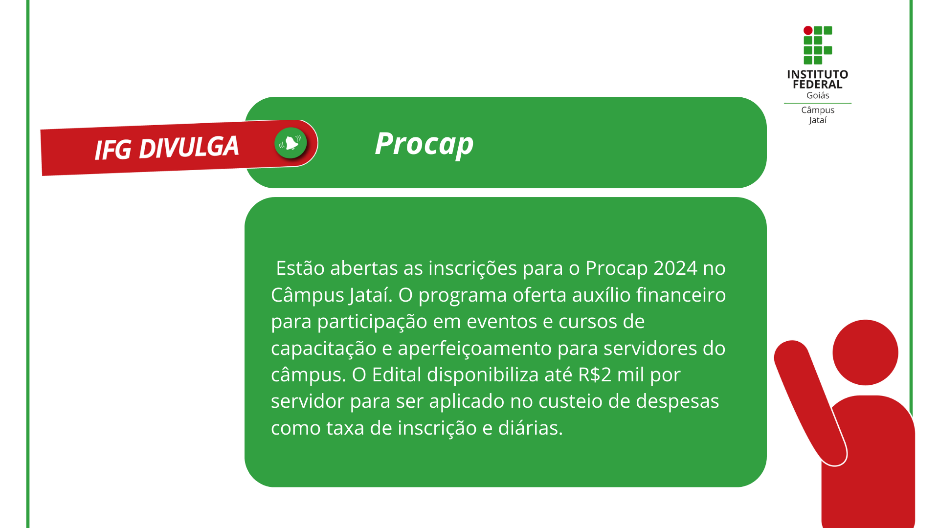 A Direção-geral do Câmpus Jataí do Instituto Federal de Goiás (IFG) publicou ontem o edital Procap 7/2024. O edital estabelece os critérios para solicitação de auxílio financeiro...