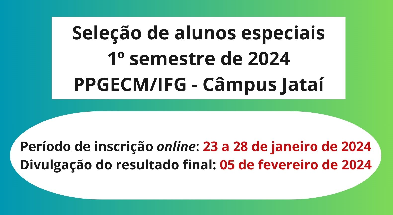 Interessados em cursar disciplinas como aluno especial no Programa de Pós-Graduação em Educação para Ciências do Câmpus Jataí do Instituto Federal de Goiás podem se inscrever entre...