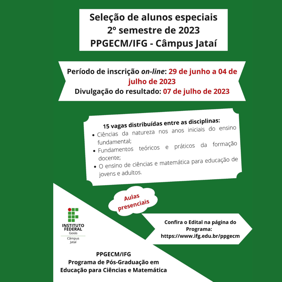 Estão abertas as inscrições para aluno especial no Programa de Pós-Graduação em Educação para Ciências e Matemática do Câmpus Jataí do Instituto Federal de Goiás (IFG). No...