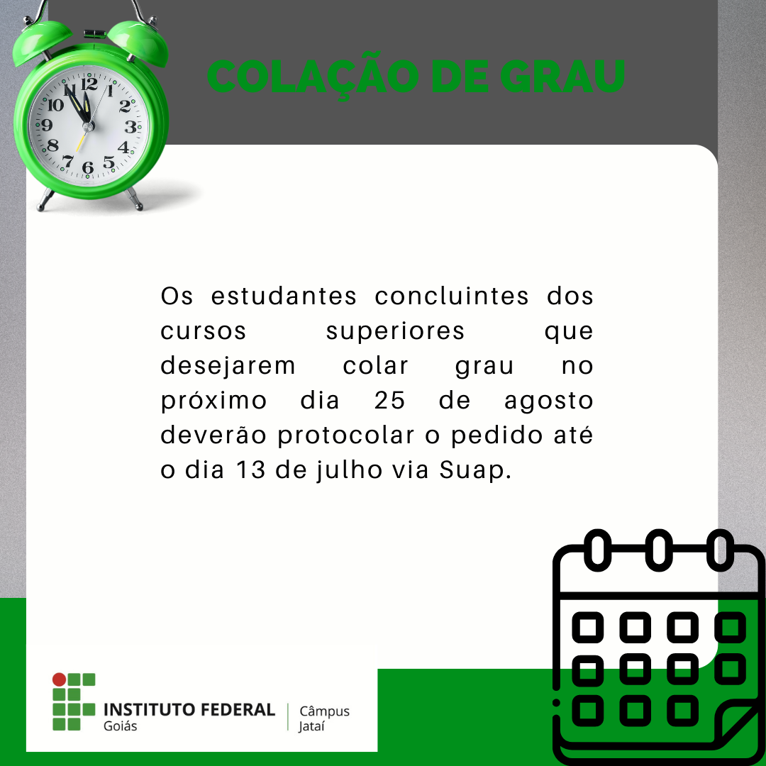 O Câmpus Jataí do Instituto Federal de Goiás (IFG) alterou por meio de resolução do concâmpus a data limite para solicitação de colação de grau para o dia 13 de julho. Os...