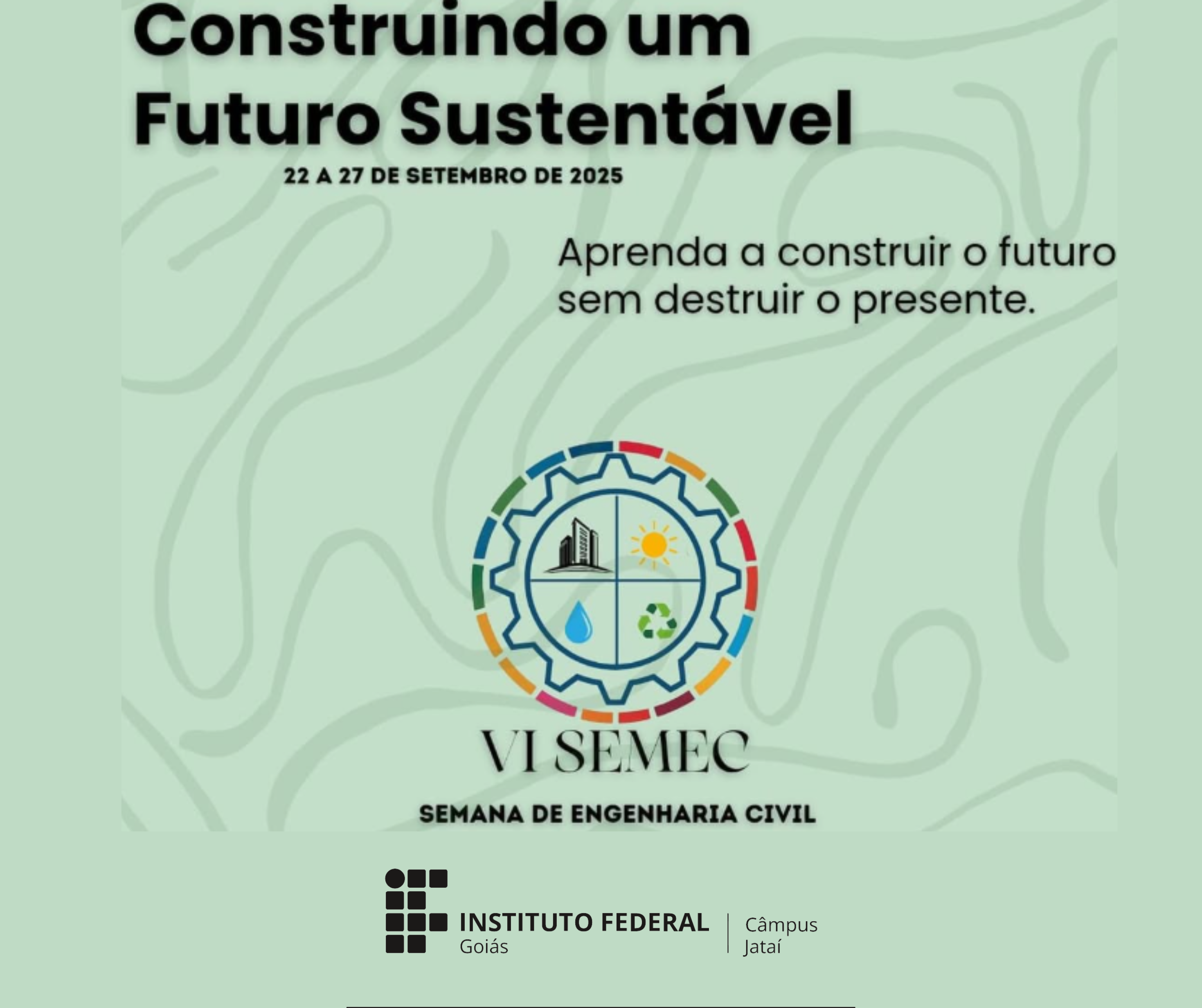 O Câmpus Jataí do Instituto Federal de Goiás (IFG) realiza, entre os dias 22 e 27 de setembro de 2025, a VI Semana de Engenharia Civil (SEMEC), com o tema “Construindo um futuro...