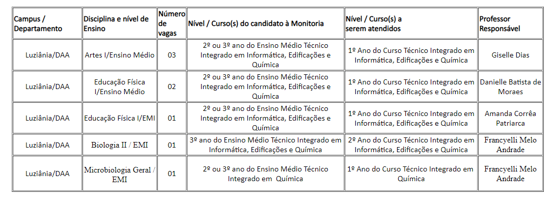 São disponibilizadas oito vagas para estudantes dos cursos técnicos integrados ao ensino médio integral. Os alunos interessados devem se inscrever pelo e-mail ca.luziania@ifg.edu.br, com os seguintes documentos: ficha de inscrição (Anexo I do edital); histórico escolar; cópia do documento de identidade; comprovante de residência com CEP. Os documentos deverão estar em arquivo único no formato PDF.