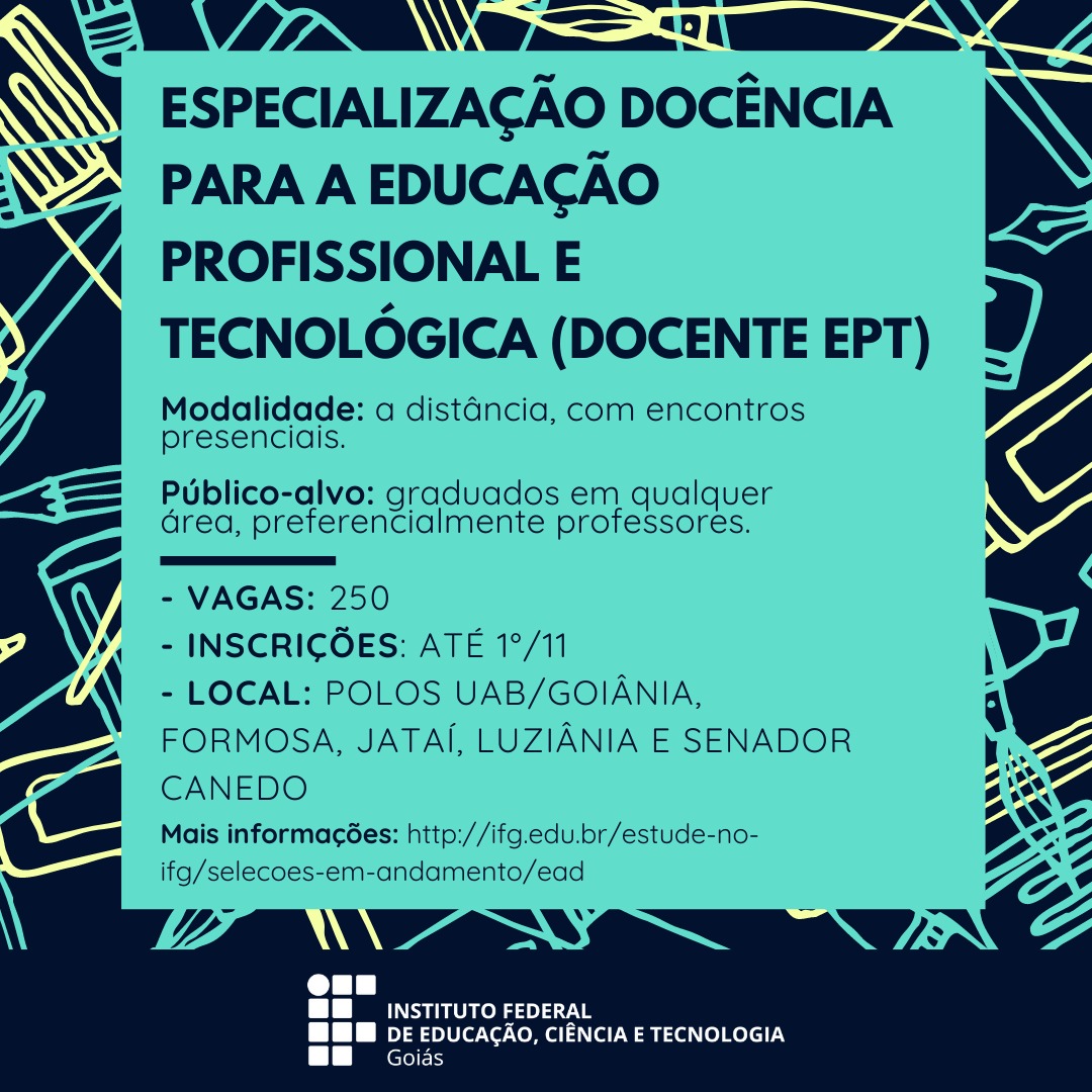 A Pró-Reitoria de Ensino (Proen) do Instituto Federal de Goiás (IFG), em parceria com a Universidade Aberta do Brasil (UAB) e Coordenação de Aperfeiçoamento de Pessoal de Nível Superior (Capes), está selecionando alunos para o curso de pós-graduação lato sensu em Docência para a Educação Profissional e Tecnológica (Docente EPT). O curso, que é gratuito, assim como as inscrições, será na modalidade a distância, com alguns encontros presenciais, conforme o planejamento das disciplinas. As inscrições estão abertas até 1º de novembro.
