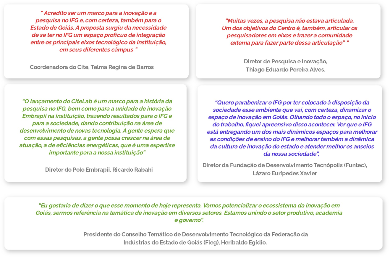 O reitor destacou durante a sua fala que o CiteLab “é um espaço onde pode-se concretizar o ensino, a pesquisa e a extensão, além da inovação tecnológica. A perspectiva de ter no mesmo ambiente estudantes de várias modalidades de ensino é um diferencial dos Institutos”, afirmou. Segundo Jerônimo, a estrutura multicâmpus vai proporcionar o encontro entre pesquisadores do IFG e de outras instituições, além de promover o desenvolvimento do Estado de Goiás.