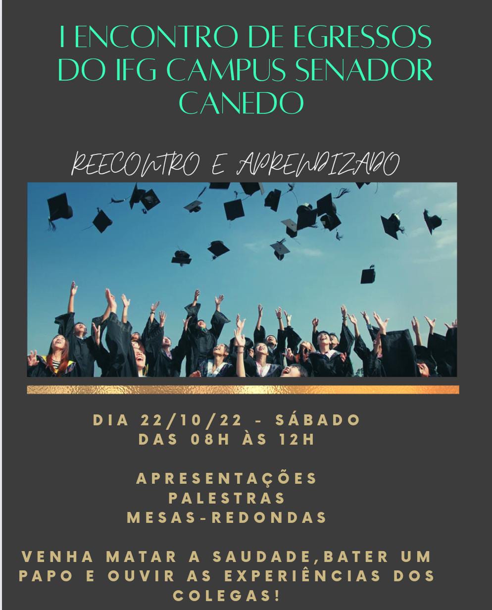 O Departamento de Áreas Acadêmicas (DAA), a Gerência de Pesquisa, Pós-Graduação e Extensão (Gepex) e o Comitê de Local de Acompanhamento de Egressos realizam na manhã do dia 22 de outubro, sábado, o I Encontro de Egressos do Câmpus Senador Canedo do Instituto Federal de Goiás (IFG). O evento integrará a VII Semana de Educação, Ciência e Tecnologia (SECITEC), no auditório.