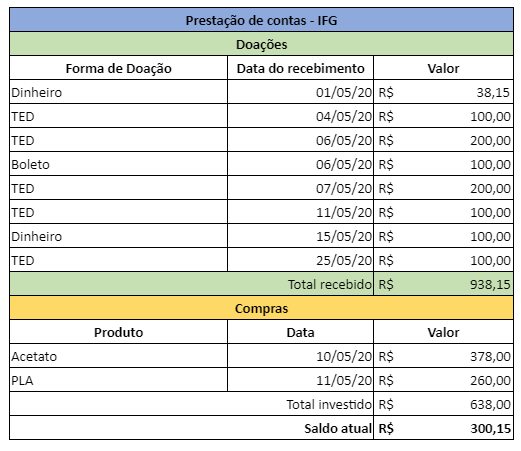 O projeto também divulgou a prestação de contas das doações realizadas para a produção dos protetores faciais. Qualquer um pode contribuir com o projeto. Para saber como doar, entre em contato pelo e-mail meninascientistas@ifg.edu.br.