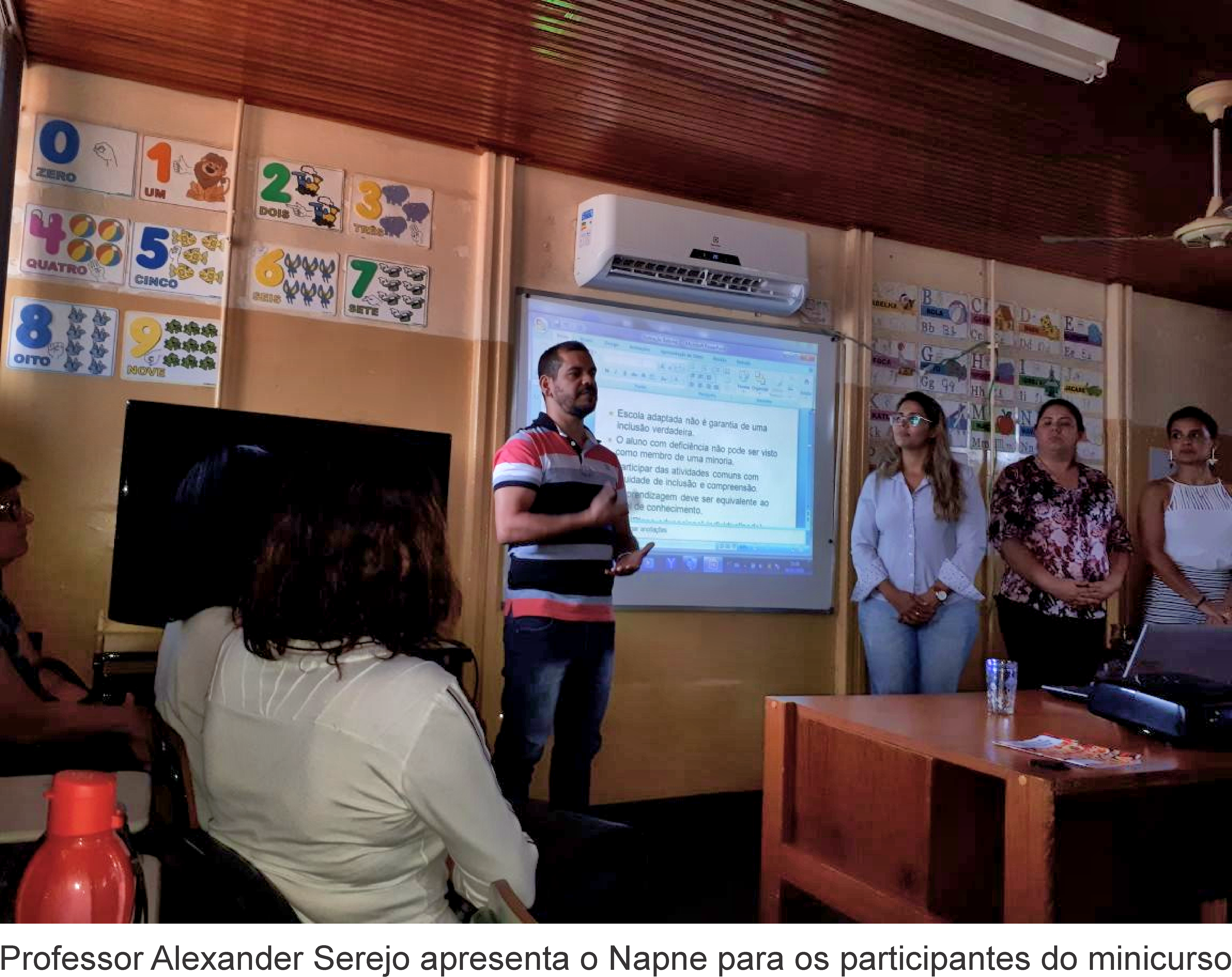 Na segunda parte do dia de estudos, Serejo teve a oportunidade de apresentar o Napne aos participantes dos minicursos. O Núcleo de Atendimento do IFG foi criado em outubro de 2017, para regulamentar as ações de apoio da instituição aos alunos com necessidades específicas.