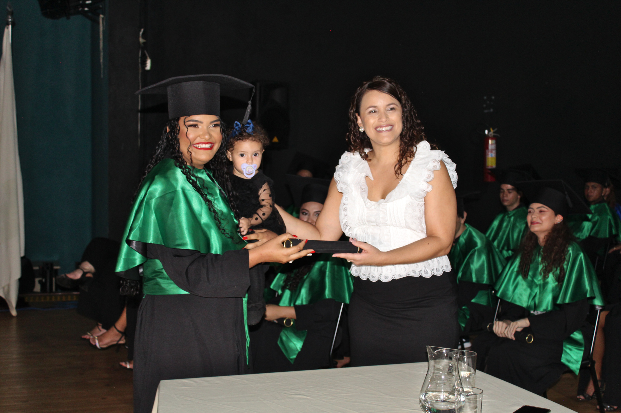 Formanda em Biotecnologia, Julia Oliveira Gomes levou a pequena Liz para participar deste momento único. A biotecnóloga se dirigiu ao palco com o seu bebê no colo e, em outro momento, também recebeu o canudo acompanhada da filha. Quando descobriu que estava grávida, Julia contou com o apoio da família, dos professores, técnicos e dos colegas de sala para dar continuidade aos estudos. Sua história foi mencionada pelo orador da turma, Arthur, que emocionou a todos. Segundo a formanda, ela foi amparada por todos nos momentos mais difíceis, da descoberta da gravidez até a retomada das aulas. "Eu só tenho o sentimento de gratidão por tudo que vem desta instituição, a todas as professoras e professores que fizeram parte dessa minha história, que inúmeras vezes me deram mais tempo para fazer alguma atividade e se encarregaram de entreter a Liz para que eu pudesse estudar. Palavras não são capazes de descrever a emoção que sinto por tudo isso", declarou Julia.