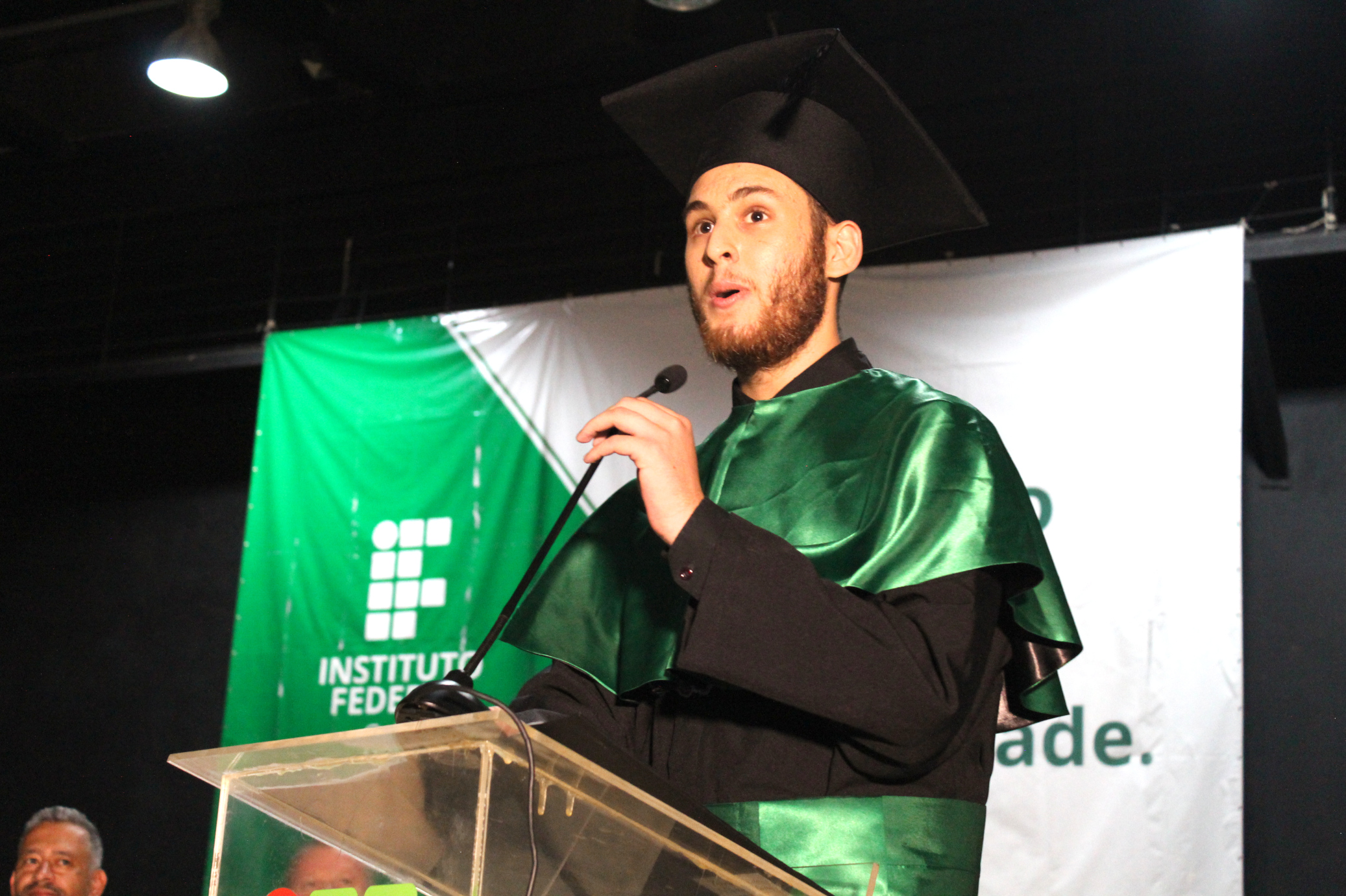 O orador da turma de Biotecnologia, Arthur Wentz e Silva, lembrou que ciência se faz com coragem. “Fazer ciência, assim como nos ensina o gigante [Machado de Assis] é, de fato, ser corajoso o bastante para levar cuidado às pessoas e ao espaço que vivemos”, justificou. O orador citou problemas enfrentados durante o curso, como a pandemia, a falta de investimentos e a polarização. “Quando a ciência, a vacinação e a Biotecnologia foram colocadas à prova, lá estávamos nós, provando sua importância”, declarou ele.