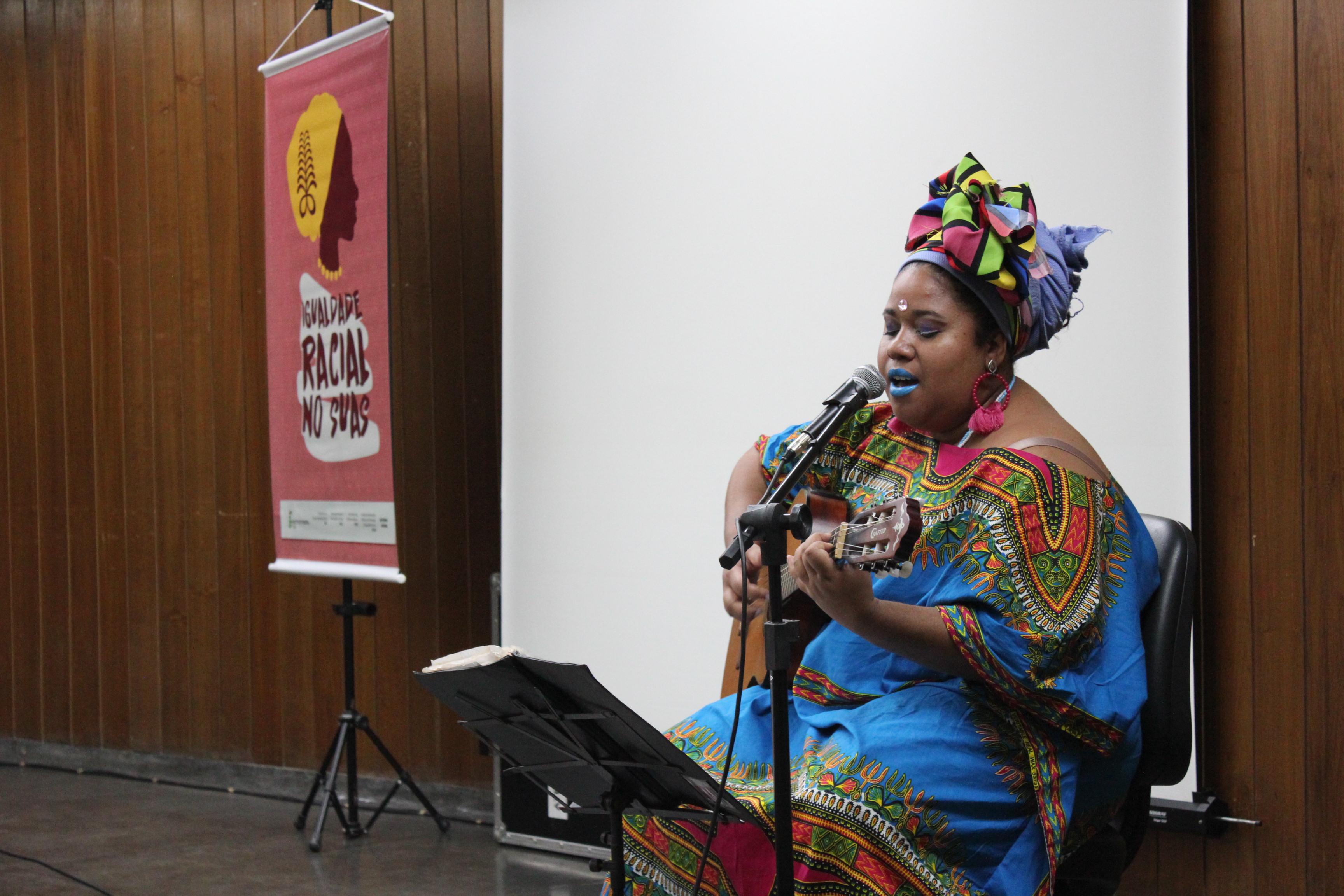 Tayná Janaína, cantora, musicista e aluna do IFG, apresenta-se na abertura do evento