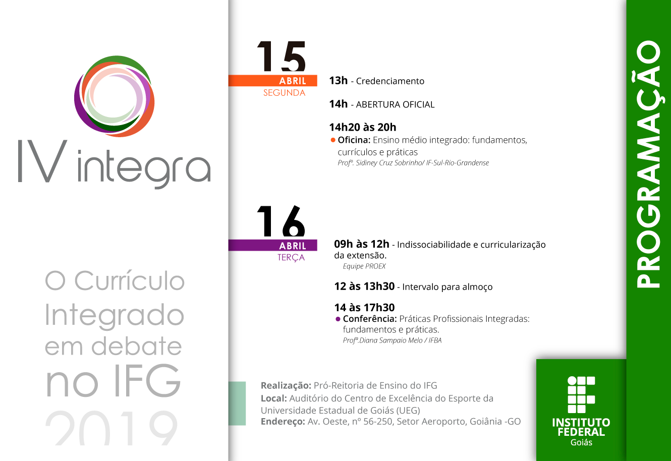 As atividades do IV Integra terão início no dia 15 de abril, às 13 horas, com credenciamento e abertura oficial às 14 horas. Logo após, será realizada a oficina Ensino médio integrado: fundamentos, currículos e práticas, do professor Sidinei Cruz Sobrinho, que seguirá até às 20 horas.