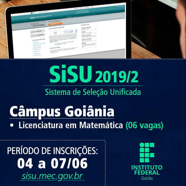 O Sisu é o sistema informatizado do MEC que seleciona candidatos aos cursos de graduação das instituições públicas de educação superior a partir da nota do Exame Nacional do Ensino Médio (Enem). Para concorrer às vagas do curso de Licenciatura em Matemática ofertadas para o segundo semestre de 2019 no IFG, o estudante tem de ter participado da edição de 2018 do Enem, sem ter tirado nota zero.