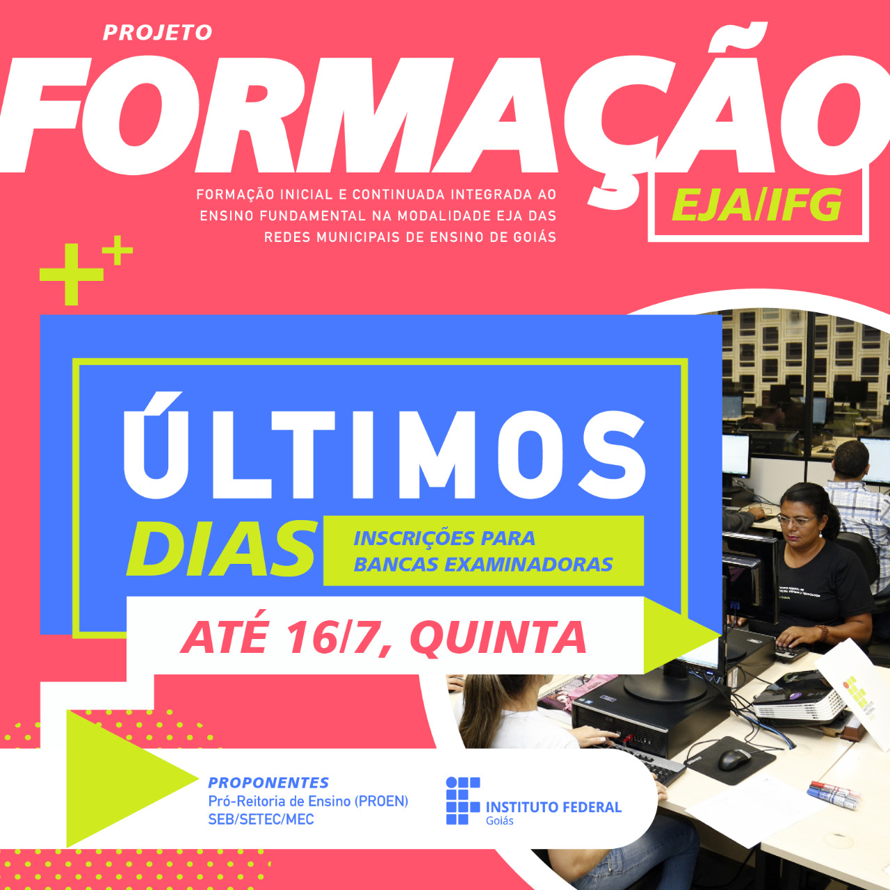 Você está aqui: Página inicial > Últimas Notícias > IFG > Câmpus > Goiânia > Notícias do Câmpus Goiânia > Inscrições para seleção de banca examinadora do Projeto Formação EJA encerram-se no dia 16