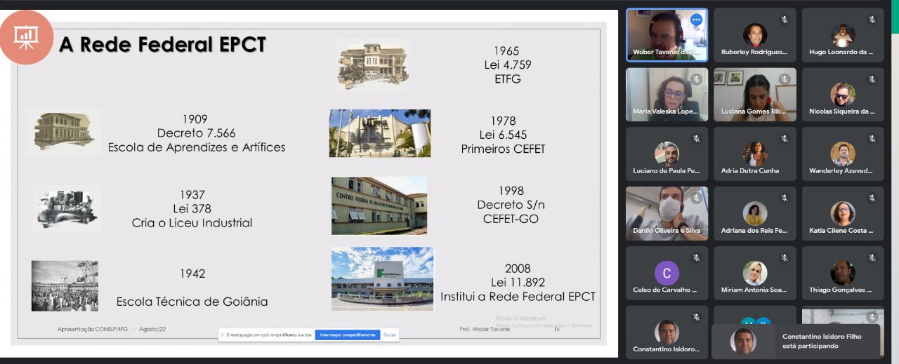 O Instituto Federal de Goiás (IFG) iniciou na tarde desta quarta-feira, 17, a primeira edição de uma formação voltada aos conselheiros, titulares e suplentes do Conselho Superior (Consup) da Instituição. A capacitação, que é realizada de forma on-line, por meio da plataforma Google Meet, tem como público principal os novos membros eleitos da instância. A ação é promovida pela Pró-Reitoria de Desenvolvimento Institucional e Recursos Humanos (PRODIRH), por meio da Coordenação de Capacitação e Desenvolvimento de Pessoas (CCDP).