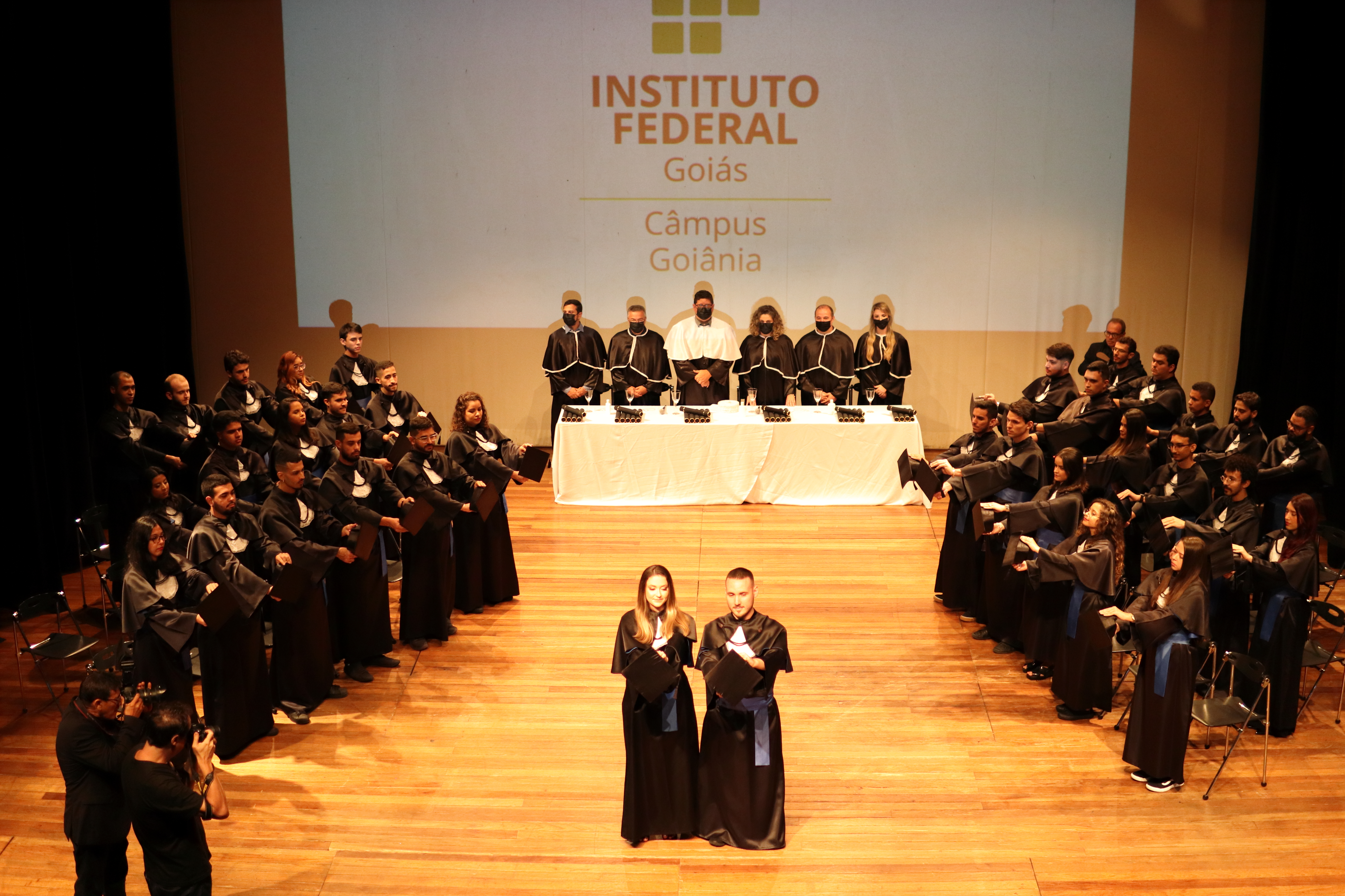 A primeira cerimônia de colação de grau dos formandos dos cursos superiores do Câmpus Goiânia do Instituto Federal de Goiás (IFG), após o período de ensino remoto adotado devido à pandemia de Covid-19, foi realizada na noite dessa segunda-feira, 19 de dezembro, no Teatro da Instituição. Devido ao espaço, que abriga 300 pessoas, o evento será dividido em dois momentos, sendo que 34 concluintes participaram na noite de hoje e outros 37 no dia 20 de dezembro, às 20 horas. Vale destacar que o Câmpus Goiânia realizou uma cerimônia simbólica, em julho desse ano, que reuniu formandos que haviam colado grau de forma administrativa durante o período de suspensão das atividades presenciais por conta da pandemia.