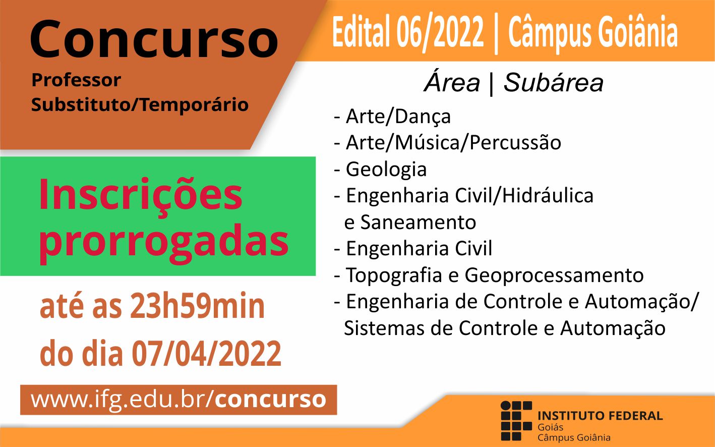 São ofertadas 7 vagas para as áreas de Artes, Geologia, Engenharia Civil, Topografia e Geoprocessamento e Engenharia de Controle e Automação