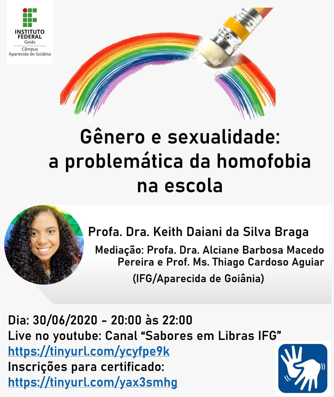 Marcando o mês nacional da visibilidade LGBT e com o objetivo de promover uma reflexão acadêmica e conceitual sobre a homofobia em espaços escolares, a professora Keith Daiani da Silva Braga ministrará no dia 30 de junho, às 20 horas, a palestra “Gênero e Sexualidade: a problemática da homofobia na escola". Keith é estudiosa de gênero e sexualidade na educação e professora no Câmpus Aparecida de Goiânia do IFG. Sua apresentação será transmitida pelo YouTube, no canal Sabores em Libras, que pode ser acessado no link.