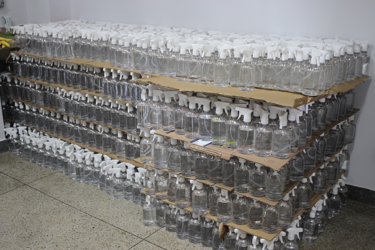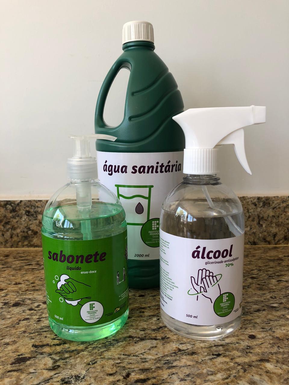 A fabricação de álcool glicerinado a 70%, sabonete líquido e água sanitária está sendo realizada nos laboratórios de Química do Câmpus Aparecida de Goiânia e a distribuição dos kits à população será feita com apoio da Prefeitura Municipal.