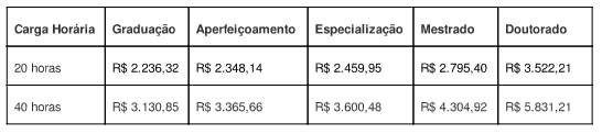 A remuneração básica para professor substituto varia de acordo com a carga horária, 20h ou 40h, e sua titulação (graduação, aperfeiçoamento, especialização, mestrado e doutorado). Veja o quadro abaixo: