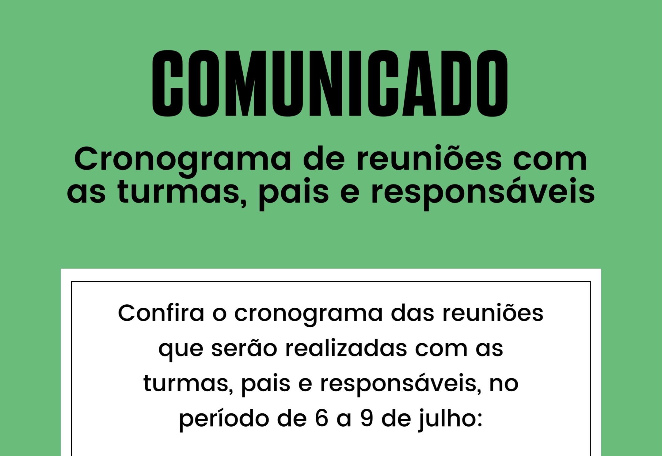 O Departamento de Áreas Acadêmicas divulgou o cronograma das reuniões com as turmas, pais e responsáveis para a próxima semana (6 a 9 de julho): Cronograma de...