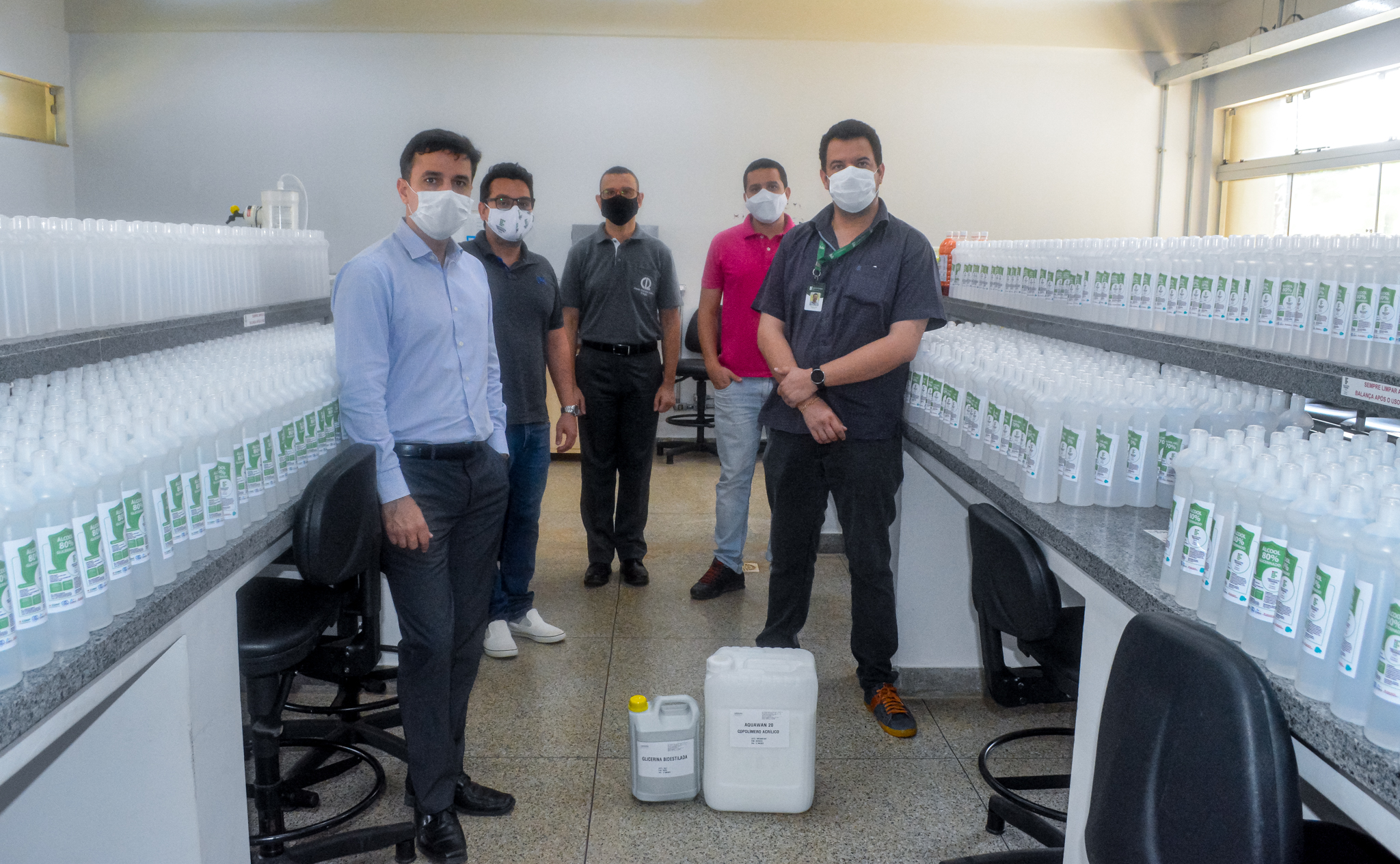 O diretor-geral do Câmpus Formosa, Thiago Gonçalves Dias, o gerente de pesquisa, pós-graduação e extensão, professor Bruno Quirino Leal, e o professor responsável pelo projeto, Diego Alves Rodrigues, formaram a equipe que acompanhou a visita ao laboratório de produção dos higienizantes. Até o dia 21 de outubro já foram produzidas 295 garrafas de álcool gel 70% (equivalente a 147,5 litros), 1.209 garrafas de álcool glicerinado 80% (604,5 litros), 296 garrafas de álcool 70% (148 litros) e 88 garrafas de sabonete líquido (44 litros). Todas as garrafas são de 500ml.