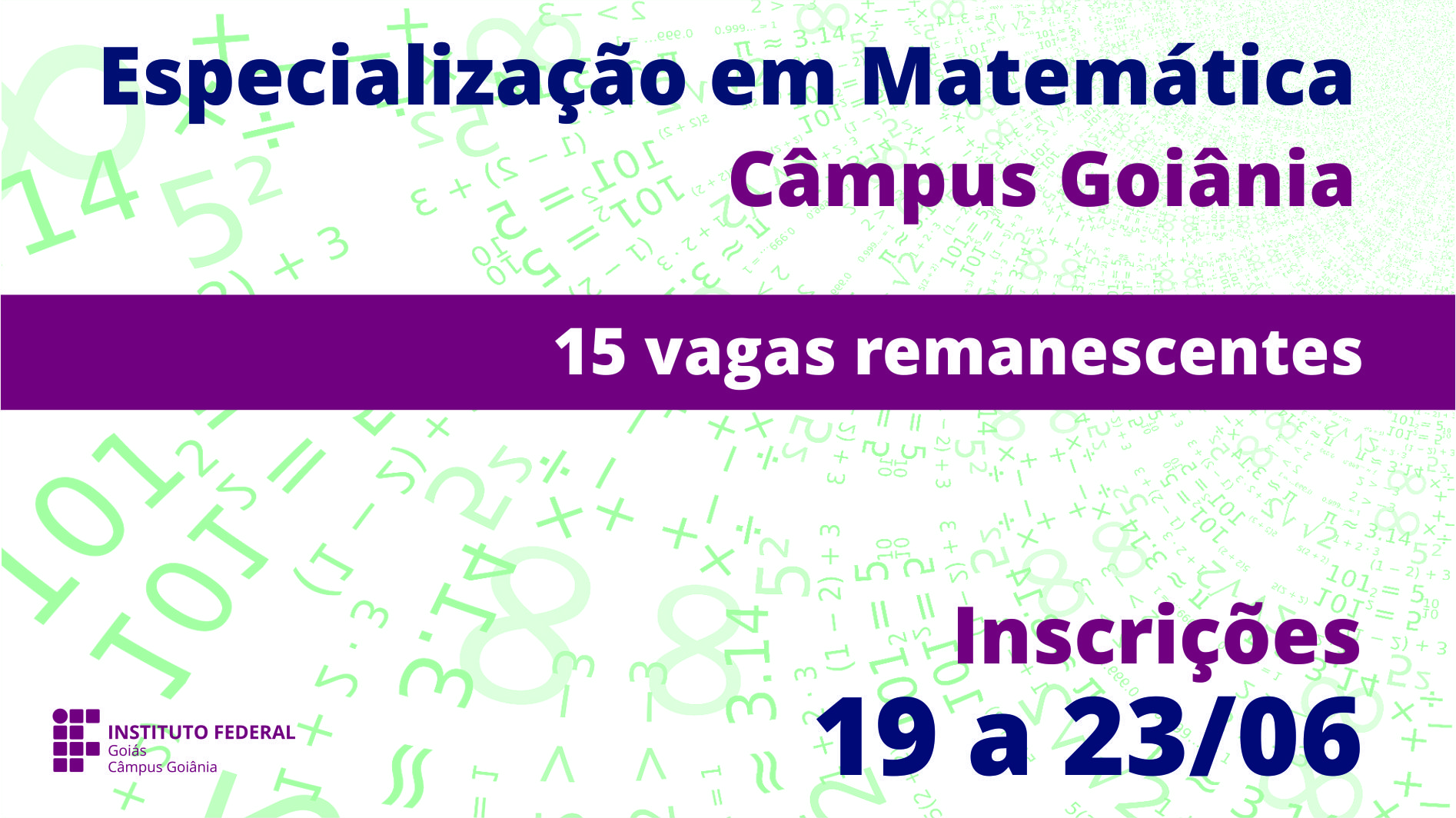 O Câmpus Goiânia do Instituto Federal de Goiás oferta 15 vagas remanescentes para a pós-graduação lato sensu em Matemática, 20% das oportunidades são destinadas a servidores do IFG. As inscrições, que são gratuitas, estarão abertas do dia 19 a 23 de junho, pela página Estude no IFG. A especialização tem duração de três semestres, com carga horária total de 450 horas e as aulas são ministradas, presencialmente, às segundas e quartas-feiras, das 13h às 18 horas, no Câmpus Goiânia.