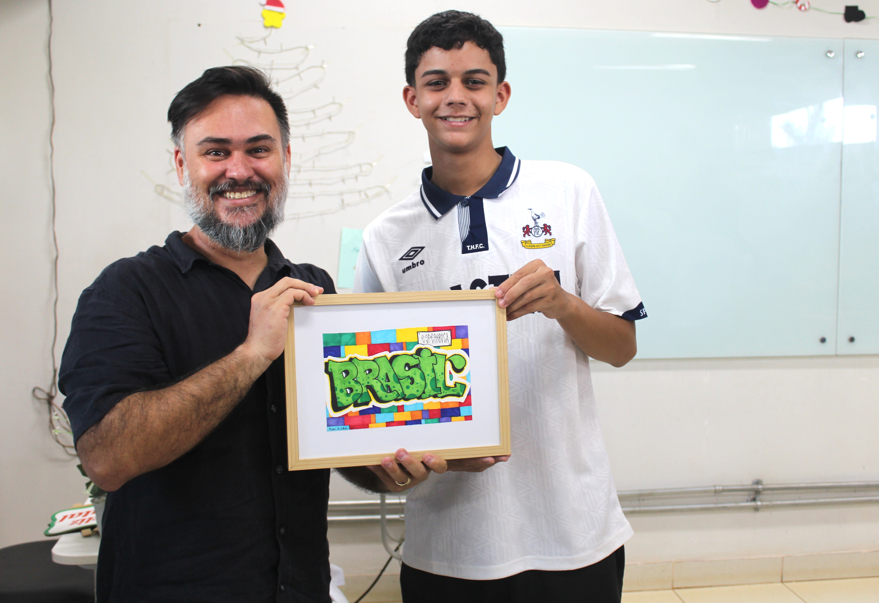 Gandara é presenteado com quadro pelo aluno Ryan Santos da Silva