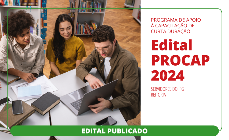 Foi publicado nesta sexta-feira, 8 de março, o edital do Programa de Capacitação de Curta Duração (Procap) dos servidores lotados na Reitoria do Instituto Federal de Goiás (IFG). As inscrições começam na quarta-feira, dia 13 de março, e seguem até o dia 5 de abril. Acesse aqui o edital.