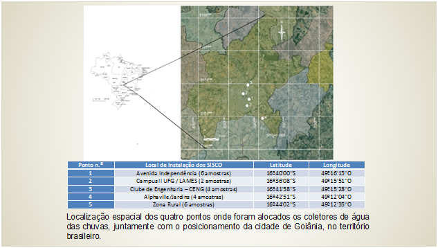 Para o estudo, foram distribuídos coletores em cinco locais de Goiânia (Avenida Independência, Câmpus II da UFG, Clube de Engenharia, Alphaville e na zona rural) durante o período de estiagem. De acordo com o artigo, as normas ambientais internacionais de controle e de monitoramento do ar atmosférico controlam somente as emissões de Óxidos de Enxofre, Óxidos de Nitrogênio, Ozônio e Chumbo. Além disso, mesmo em outras pesquisas com foco no estudo da poluição atmosférica através da análise da água das chuvas, a maioria se concentra apenas na análise de alguns elementos-traço, como Sódio, Magnésio, Zinco e Manganês.