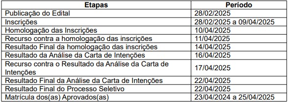 São duas as etapas do processo seletivo: Exame da Documentação com Homologação da Inscrição e Análise da Carta de Intenções. O candidato terá toda a documentação verificada e, caso esteja de acordo com o edital, a inscrição será homologada.