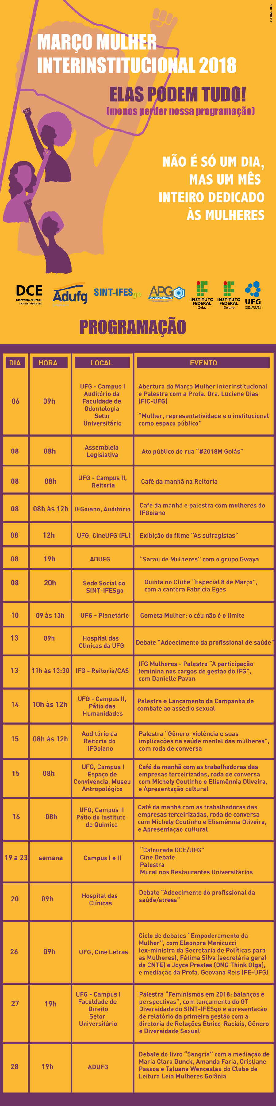 O Instituto Federal de Goiás (IFG), a Universidade Federal de Goiás (UFG) e o Instituto Federal Goiano, além de outros parceiros, se uniram para comemorar o mês da Mulher, que será marcado por intensos debates e por uma ampla programação. Intitulado “Mulher Interinstitucional 2018”, o evento terá palestras, reuniões, ato público, campanha de combate ao assédio às mulheres, dentre outras.